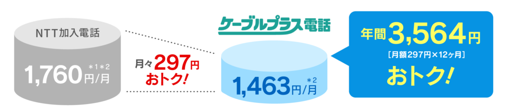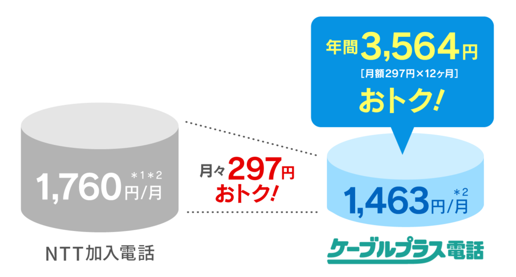 *1 住宅用1、2級取扱局のプッシュ回線用料金。NTT東日本・NTT西日本の@ビリング、Myビリングの場合、121円/月が減額されます(お客様のお支払方法やご利用の回線種別・取扱局によっては対象外となります)。*2 別途ユニバーサルサービス料、電話リレーサービス料および通話料が必要となります。ユニーバーサルサービス料、電話リレーサービス料はそれぞれユニバーサルサービス支援機関、電話リレーサービス支援機関より発表される番号単価に基づきご請求させていただきます。番号単価は各支援機関のホームページ(ユニバーサルサービス料:https://www.tca.or.jp/universalservice/、電話リレーサービス料:https://www.tca.or.jp/telephonerelay_service_support/)にて発表されます。 ※ケーブルプラス電話にご加入の際は、別途工事費がかかる場合があります。