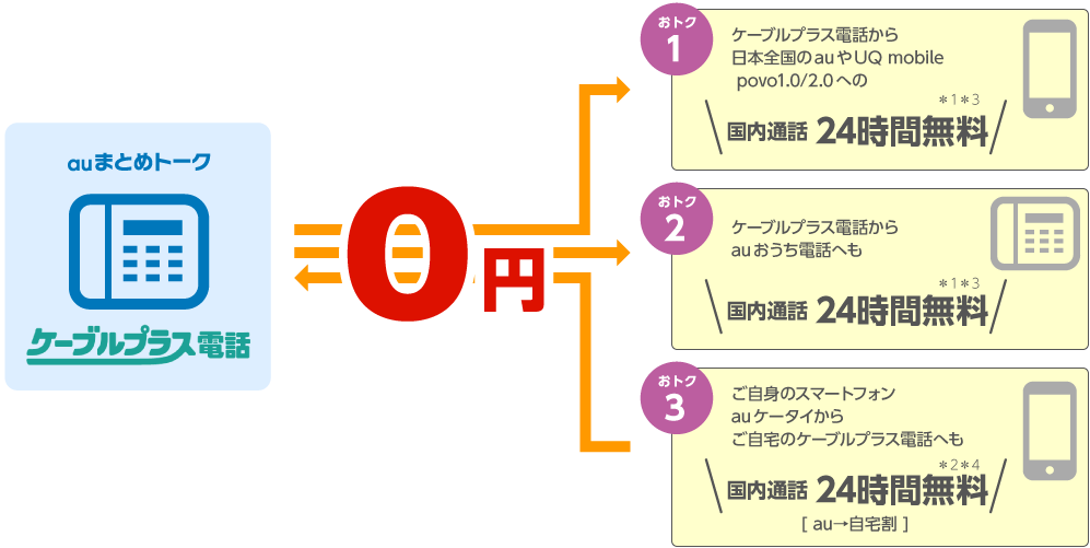 *2【適用条件】auスマートフォン、auケータイご契約者のご自宅電話番号にケーブルプラス電話をご登録の場合。